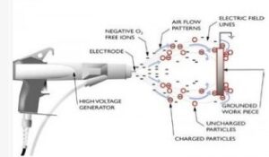 برای رنگ آمیزی به این روش، پودر میکرونیزه ریخته شده داخل گان تحت ولتاژ بالا باردار شده (بارمثبت) و بعد از عبور از لوله گان به وسیله فشار باد پاشیده می شود از طرف دیگر از آنجاییکه قطعه دارای بار منفی (اتصال ارت) می باشد پودر را به خود جذب می کند، پودر به صورت یکنواخت کل سطح قطعه با هر ابعاد و زاویه ای را می پوشاند و هیچ اثر رنگ نشدگی بر روی قطعه باقی نمی گذارد، بعد از عمل پاشش رنگ در کوره تحت دمای 200 درجه سانتی گراد به مدت 13 دقیقه پخته می شود.