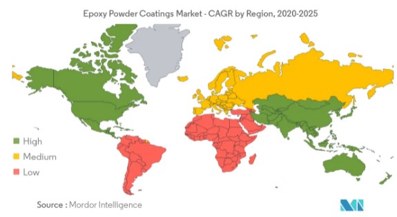 امروزه، میزان تقاضا برای پوششهای پودری اپوکسی در صنعت ساختمان با افزایش رو به رو شده است. مطالعات نشان می دهد که صرف نظر از همه گیری ویروس کرونا تا سال 2026 سرمایه گذاری در این حوزه با رشد 3 درصدی مواجه خواهد شد. مطابق شکل زیر، پیش بینی ها نشان می دهد منطقه آسیا و اقیانوسیه در آینده بازار جهانی را تا حدی تحت سلطه خود قرار دهد. شکل زیر شمایی از پیش بینی رشد مصرف اپوکسی پودری در اقصی نقاط جهان را نشان می دهد.